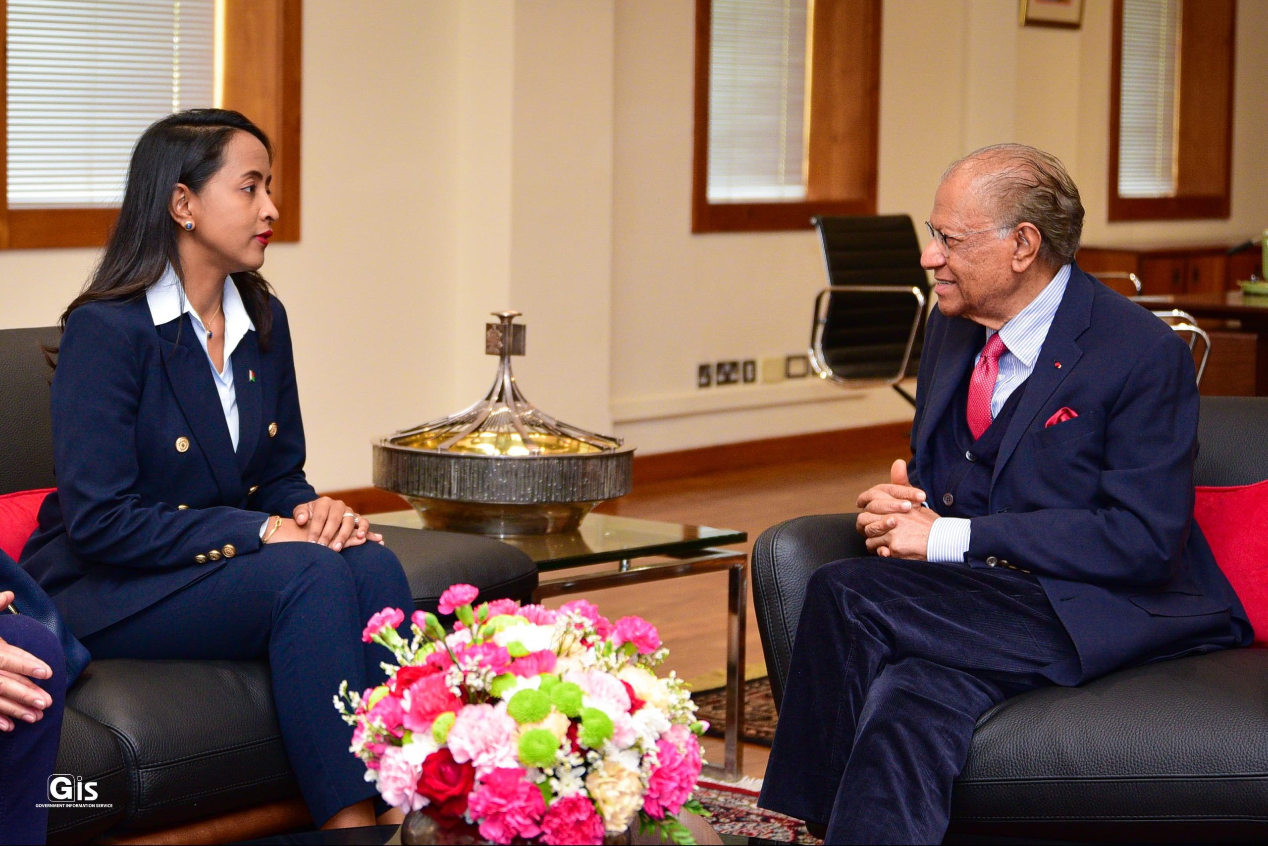 GIS – 06 February 2025: The Special Envoy of the President of the Republic of Madagascar and Minister of Foreign Affairs, Mrs Rafaravavitafika Rasata, accompanied by a delegation, paid a courtesy call, today, on the Prime Minister, Dr Navinchandra Ramgoolam, at the New Treasury Building, in Port Louis.