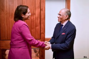 GIS – 21 Nov 2024: The High Commissioner of the United Kingdom (UK) to Mauritius, Ms Charlotte Pierre, paid a courtesy call on the Prime Minister, Dr Navinchandra Ramgoolam, this evening, at the Treasury Building in Port-Louis. In a statement, Ms Pierre said that she conveyed her congratulations to the Prime Minister and