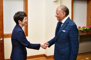 GIS – 15 May 2025: The Ambassador Extraordinary and Plenipotentiary of the People’s Republic of China to Mauritius, Dr Huang Shifang, called on the Prime Minister, Dr Navinchandra Ramgoolam, this afternoon at the New Treasury Building in Port Louis. In a statement Ambassador Huang highlighted that the strengthening of the